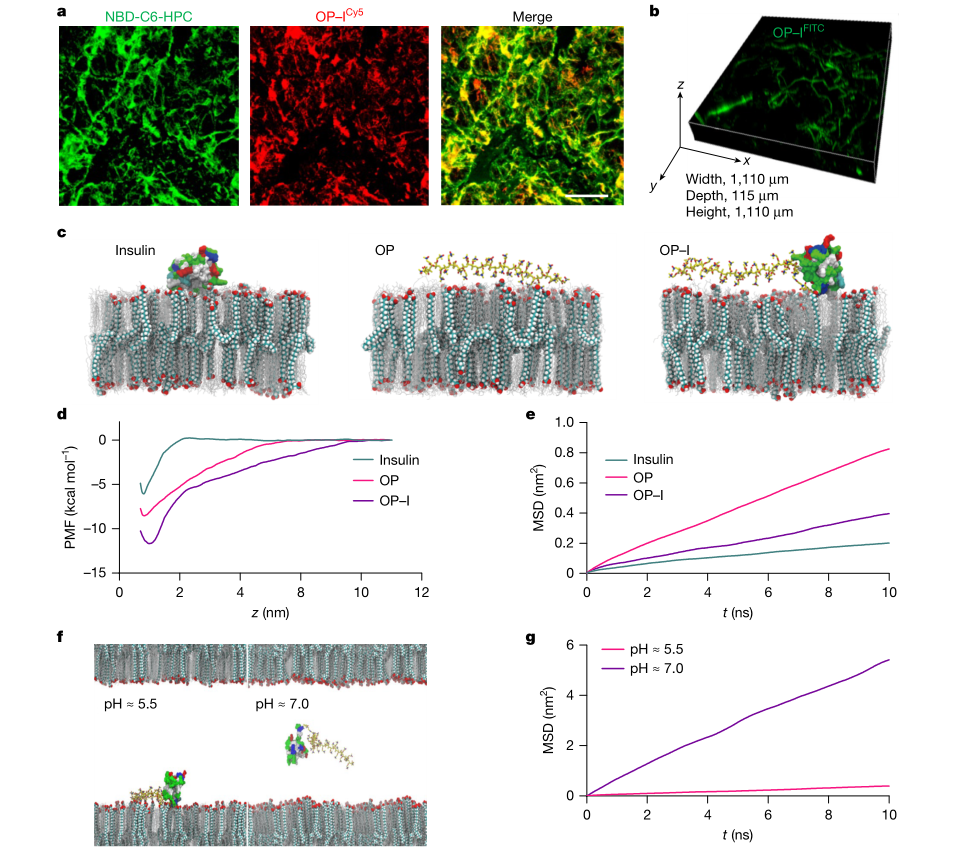 在机制层面,作者刻意区分粗暴促渗与环境响应扩散。实验结果显示,OP与OP–I并未显著增加角质层脂质的流动性,提示其并非通过破坏脂质有序性来实现穿透。同时,简单物理混合(OP+胰岛素)并不能带来可比的穿透与降糖效果,共价偶联是获得有效递送的必要条件之一。计算模拟用于量化为什么更容易扩散。作者构建包含神经酰胺、胆固醇与脂肪酸的模型角质层脂质体系,比较OP、OP–I与胰岛素在脂质表面的吸附与扩散参数。结果给出沿脂质表面扩散的能垒与摩擦差异,OP与OP–I更低的能垒与更小的摩擦对应更快的界面扩散,并且在接近中性pH下转为聚两性离子状态后,静电束缚进一步降低,与皮肤pH梯度驱动的宏观机制相一致。