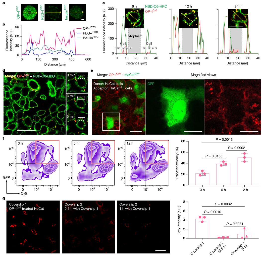 进入活体表皮后,作者用3D角质形成细胞球体结合TIRFM与共聚焦显微成像追踪OP–I的迁移方式。观察到OP–I主要定位于细胞膜并在膜上呈现可追踪的移动轨迹。细胞-细胞直接接触时会发生信号转移,而隔离细胞群并共享培养基则难以观察到转移,支持膜介导的细胞间迁移通路,并与减少胞内摄取从而降低降解的推断形成对应。最终,作者将该过程与真皮淋巴引流相联系,用于解释进入体循环的路径闭环。