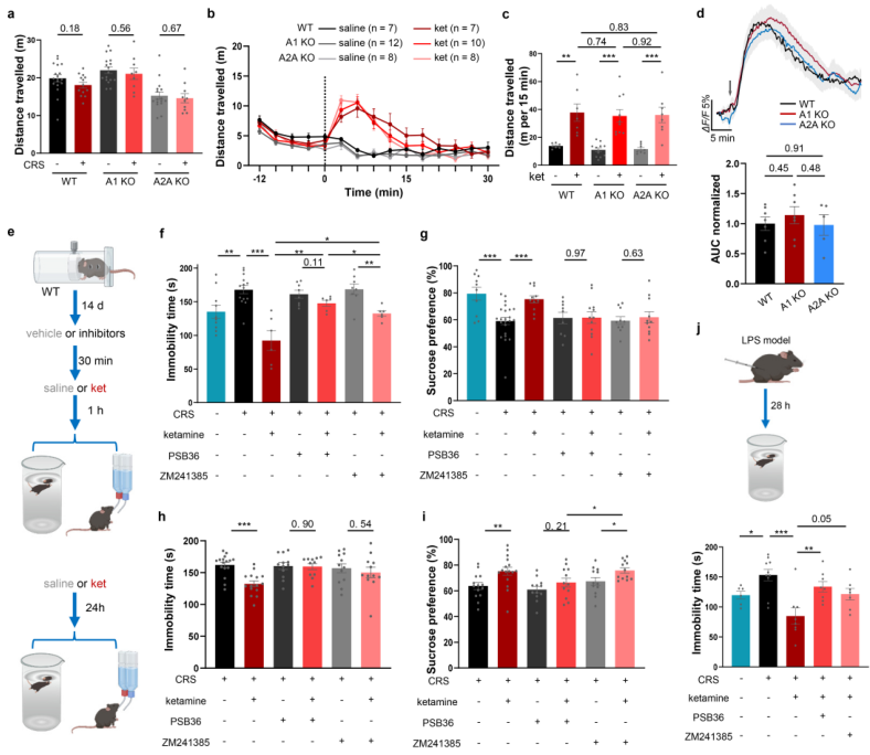 扩展数据图3|腺苷受体活性对氯胺酮抗抑郁效应至关重要,且不改变运动活动与腺苷释放