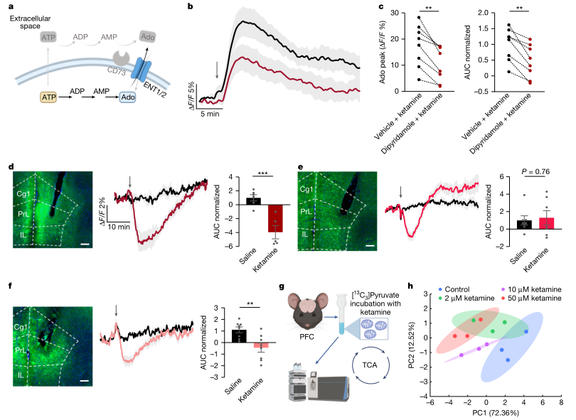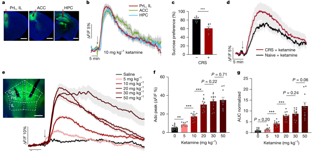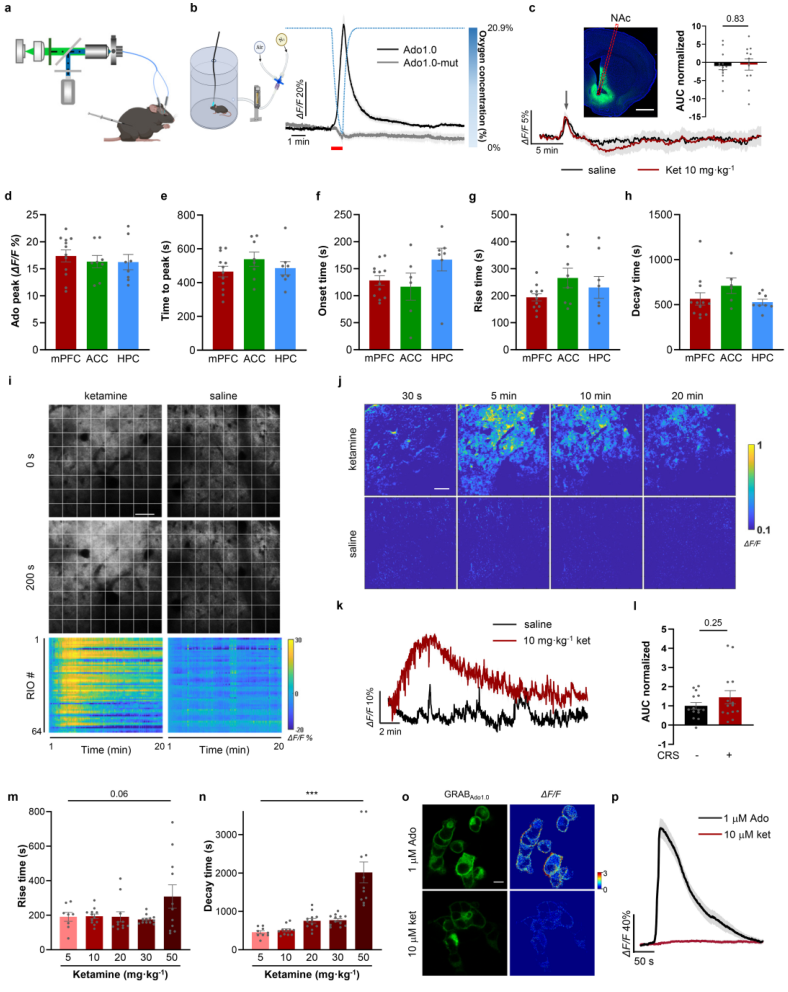 作者首先用遗传编码腺苷探针GRABAdo1.0结合多通道光纤记录,在小鼠脑内实时追踪细胞外腺苷变化,并用失活突变体与急性低氧刺激完成信号有效性校验。在此基础上,系统给药氯胺酮后,内侧前额叶皮层与海马出现快速且持续的细胞外腺苷升高,而伏隔核变化不明显,提示该效应具有脑区特异性。该结果把腺苷从“候选相关因子”推进为“可量化的动态表型”,为后续因果验证提供入口。