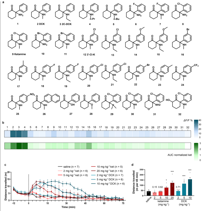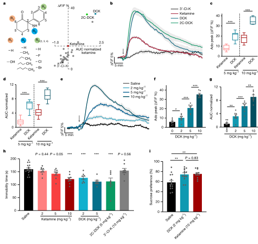 作者将mPFC腺苷动态作为功能性生物标志物,构建表型驱动的化合物筛选流程,对多种氯胺酮衍生物进行合成与体内读数比较。结果显示,部分候选可诱导更强或更持久的腺苷上升,并在抑郁模型中以更低剂量实现与氯胺酮相当的行为学改善,同时在运动相关副反应上更轻。该策略的关键价值在于,用“疗效相关的动态信号”替代单一受体亲和力或终点行为学作为优先筛选轴,使分子优化更可解释、也更可迭代。