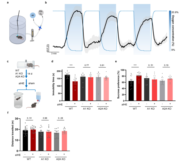 作者进一步引入急性间歇低氧训练方案,通过低氧与常氧交替循环在mPFC诱导腺苷上升并改善抑郁相关行为;当A1或A2A受体缺失时,该改善不再出现,说明该非药物干预同样汇聚到腺苷受体通路。这为围绕腺苷节点的“可控、可重复、可分层”的干预策略打开空间。