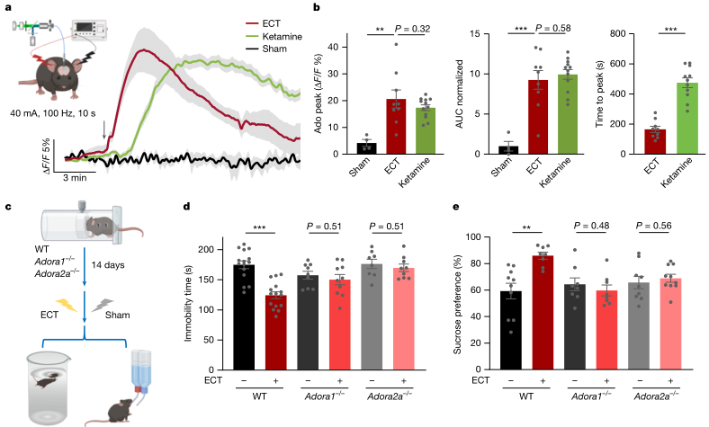作者将同一套腺苷实时记录与受体依赖性验证拓展到电休克治疗相关范式。ECT诱发的发作过程中,mPFC细胞外腺苷出现显著上升;在抑郁模型中,ECT的行为学获益同样依赖A1与A2A受体,提示腺苷信号是药物与物理干预共享的关键节点。这一结果强化了腺苷机制链条的外推性,并为后续组合疗法或替代性快速干预提供共同的可操作靶点。