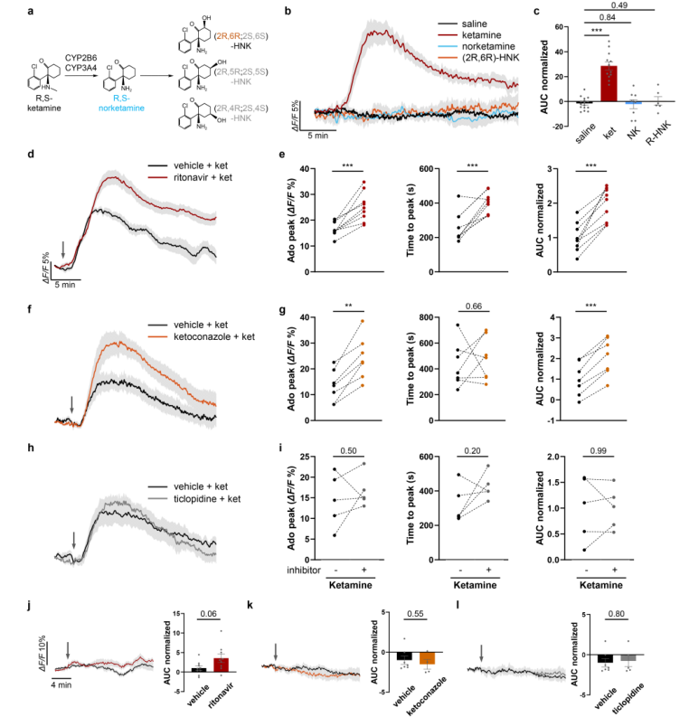 扩展数据图2|氯胺酮代谢物与代谢抑制剂对mPFC腺苷释放的影响