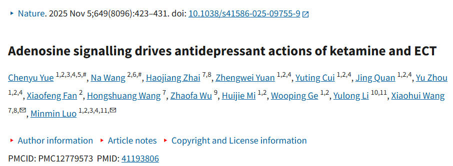 参考文献:Yue C, Wang N, Zhai H, Yuan Z, Cui Y, Quan J, Zhou Y, Fan X, Wang H, Wu Z, Mi H, Ge W, Li Y, Wang X, Luo M. Adenosine signalling drives antidepressant actions of ketamine and ECT. Nature. 2026 Jan;649(8096):423-431. doi: 10.1038/s41586-025-09755-9. Epub 2025 Nov 5. PMID: 41193806; PMCID: PMC12779573.