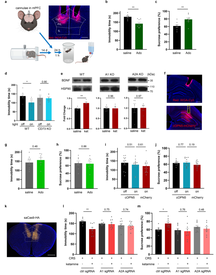 为避免机制泛化,作者将因果进一步定位到内侧前额叶皮层。mPFC局部给予腺苷可以产生显著的抗抑郁样效应;而在成年动物mPFC内通过AAV递送CRISPR-Cas9体系局部敲低A1或A2A受体后,系统给药氯胺酮的行为学疗效被消除。相对地,将相似策略转移到其他脑区并不能稳定复现同等行为学获益,说明mPFC腺苷受体通路是该快速效应链条中的关键空间环节。