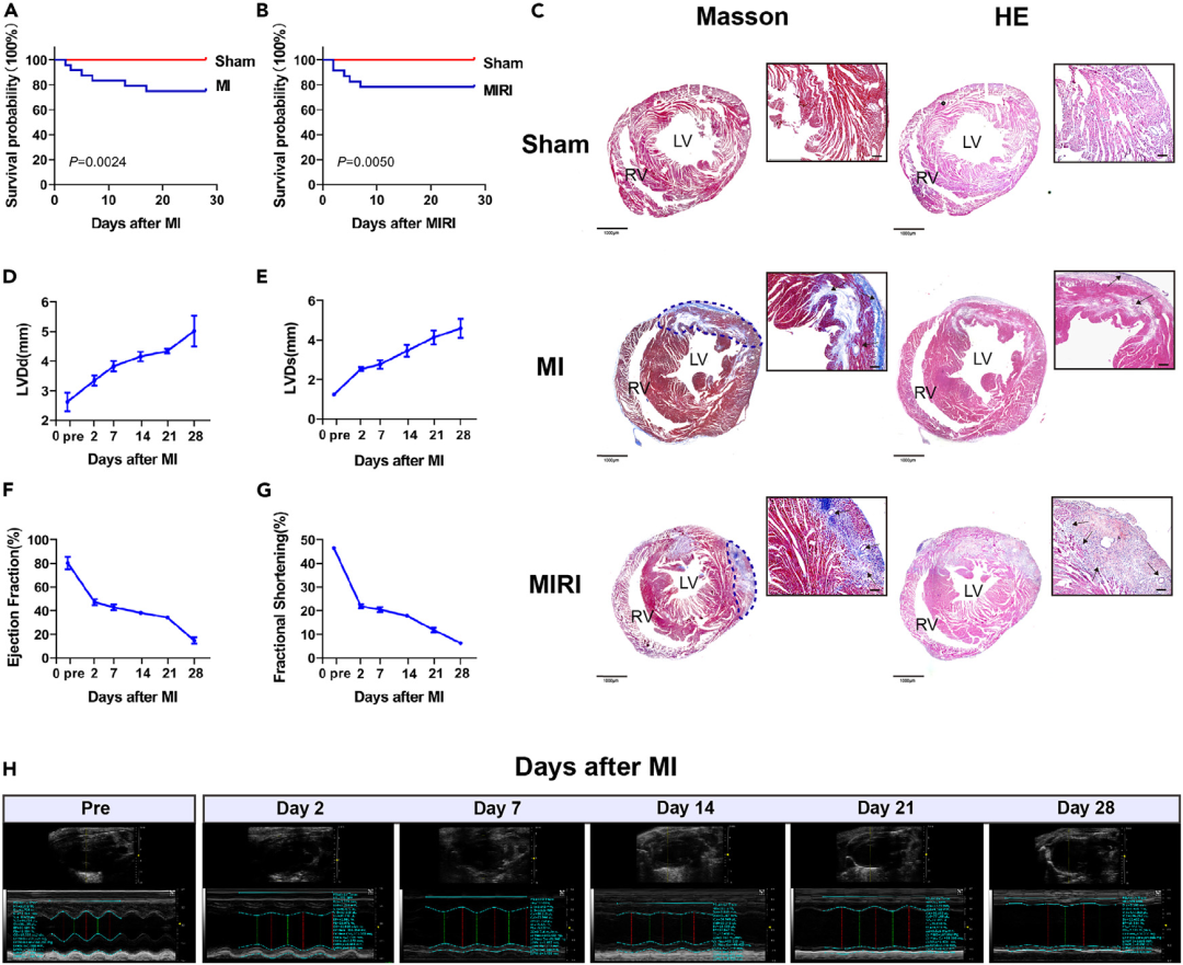 组织学:心脏固定、石蜡包埋与切片,进行HE及Masson染色,并可用ImageJ进行面积/结构定量。