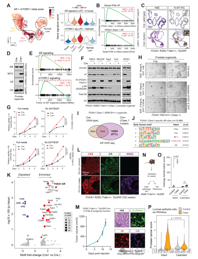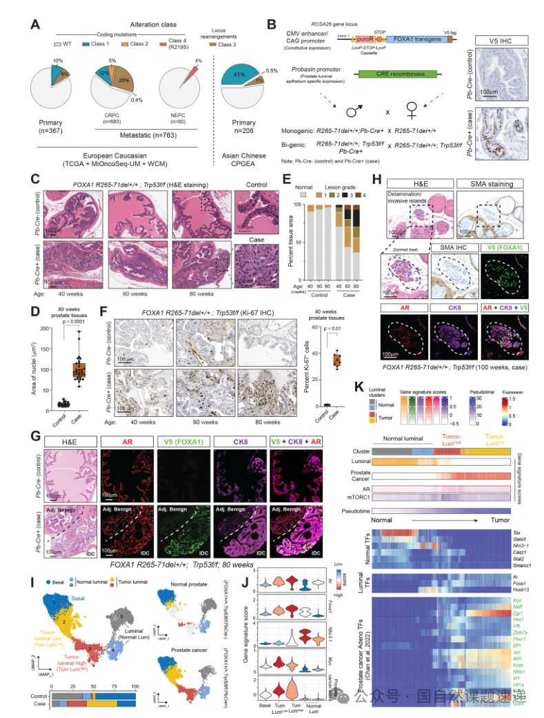 研究首先在体内建立Class1代表突变的条件性表达模型,使突变FOXA1在前列腺上皮细胞中被激活表达,并通过表位标记确认其定位。随年龄增长,模型动物出现从上皮增生到上皮内瘤变,再到局灶性导管内癌灶的病理演进。进一步结合Trp53缺失背景后,病变等级与侵袭性显著增强,提示Class1突变在抑癌基因缺失的背景下更容易跨越肿瘤发生门槛。