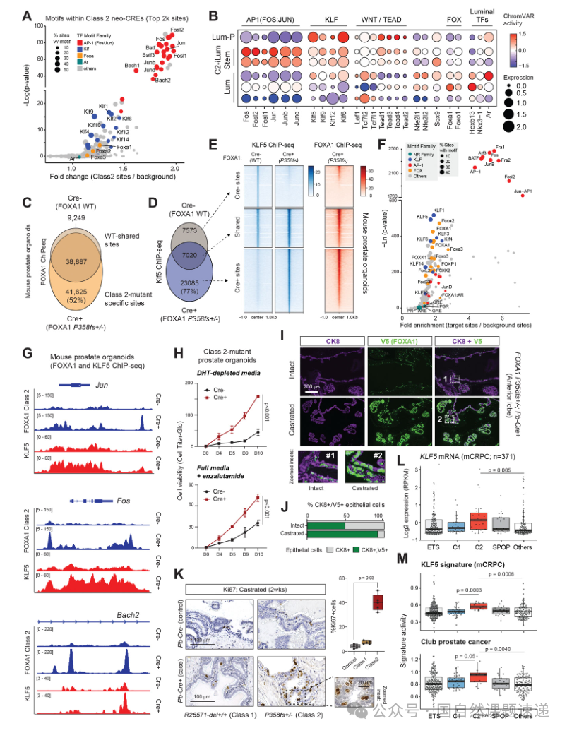在机制落地方面,研究通过FOXA 1与KLF5的ChIP-seq比较野生型与Class2突变体的占位差异,发现突变体获得大量新结合位点,并与KLF5在新增位点上共占位,同时突变体还直接促进 AP-1 家族因子相关基因座的转录激活,形成自增强回路。功能层面,Class2 突变类器官在去雄条件以及AR拮抗剂处理下仍维持更强的生长与存活能力,符合治疗耐受表型。体内去势后,突变表达细胞在腔面细胞群中的比例显著上升并伴随增殖信号增强,提示治疗压力造成对耐受细胞的选择性富集,这是“耐药演进”在组织层面的直接证据。