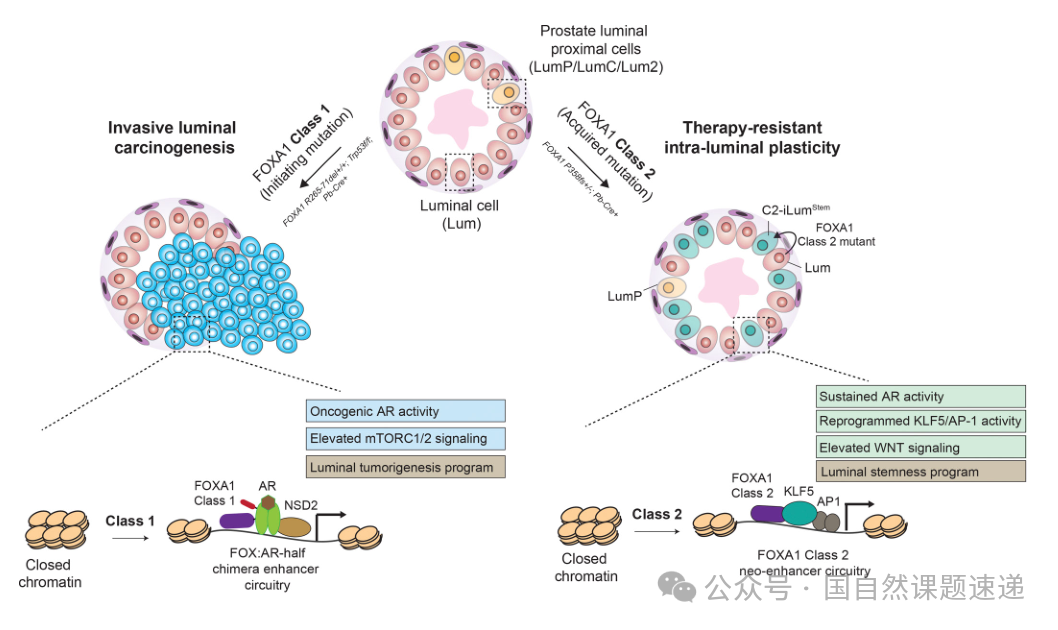 图5 FOXA1Class1与Class2突变在促肿瘤发生与治疗耐受中的不同致癌机制示意