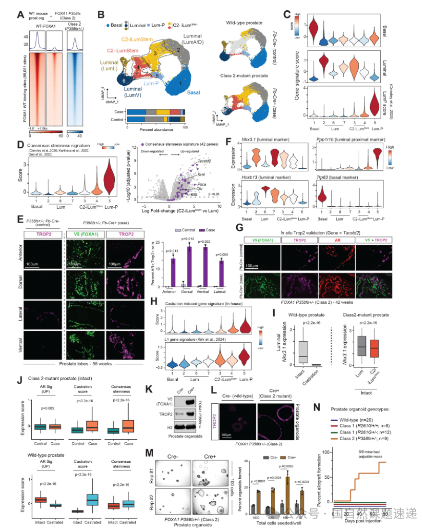 为避免“原本就存在的祖细胞扩增”这一替代解释,研究进一步在组织切片层面用标志物免疫染色进行共定位验证,显示干性相关标志阳性细胞显著增加,并与突变FOXA1表达细胞高度重叠;同时这些细胞仍表达AR及腔面分化相关标志,支持“分化腔面细胞被重编程为具备部分祖细胞特征的状态”,即腔内可塑性增强。