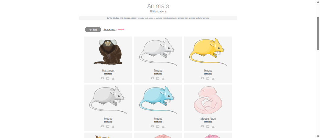 如果你做的是医学、生物、药理、病理、免疫这类方向,SMART-Servier Medical Art基本属于绕不开的资源。这个平台提供超过3000张免费的医学插图,覆盖解剖、病理、生理、治疗等多个模块,官方还明确说明这些图可以用于演示文稿、论文、海报和教学材料。如果用在公开材料里,图注或致谢要写清来源。