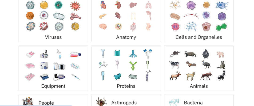 如果你对素材准确性要求更高,那NIHBioArtSource值得优先收藏。这个资源库由美国NIH下属的NIAID推出,是由专业医学插画师制作的免费科学和生物医学艺术资源库,现有2000多份视觉素材,覆盖病毒、解剖、细胞器、设备、蛋白、分子、模板等多个类别。下载使用前,还是要看具体素材页面的授权说明。