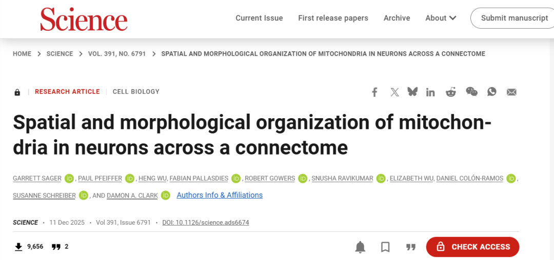 Science近期发表的题为Spatial and morphological organization of mitochondria in neurons across a connectome 的文章提出,神经元内线粒体的分布并非松散地响应局部能量需求,而是沿着细胞类型、神经元区室和连接关系呈现出高度有序的组织规则。这个发现把线粒体从神经元中的“背景结构”推进到回路组织的核心位置,也为理解神经代谢支持、突触可塑性以及神经系统疾病中的细胞器失衡提供了新的观察框架。