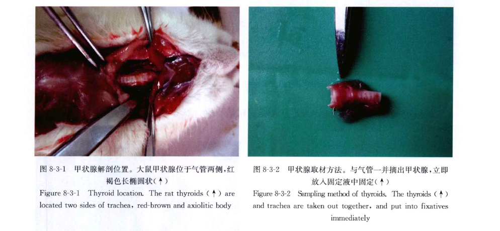 大鼠甲状腺位于喉下方,剪开颈部皮肤暴露出气管,见气管两侧呈长椭圆形、红褐色的甲状腺。将气管一并摘出直接放入固定液内固定。甲状腺分左右两叶,中间以峡部相连(图8-3-1,图8-3-2)。